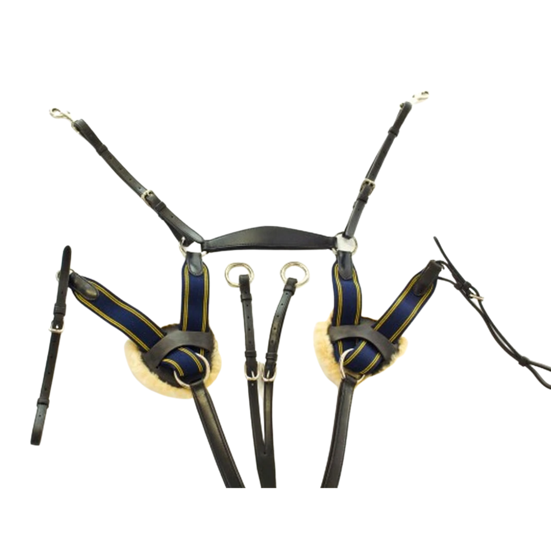Beautifully crafted from the finest English leather, this breastplate features lots of adjustment for that perfect fit. Featuring navy with yellow trim elastic points and sheepskin padding on the shoulder. Running rings attached. Available in Black or Brown leather. Choice of size: Cob or Full