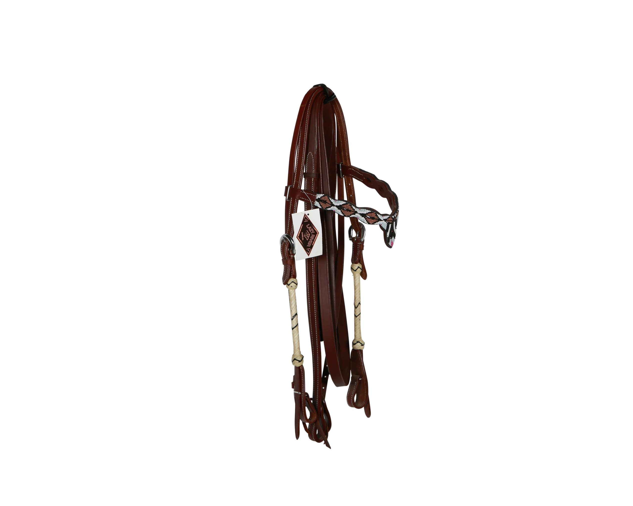 The Colourful Beaded Western Bridle is a stunning brown leathered bridle. This bridle has a unique and bold browband made from small beads to create a striking pattern on any horse. The cheek pieces on this bridle are made to stand out, with a natural weave that has been rolled plaited with black details. This bridle is suitable to any horse in any discipline and is the perfect bridle to add some wow to your tack! Available in sizes cob and full.