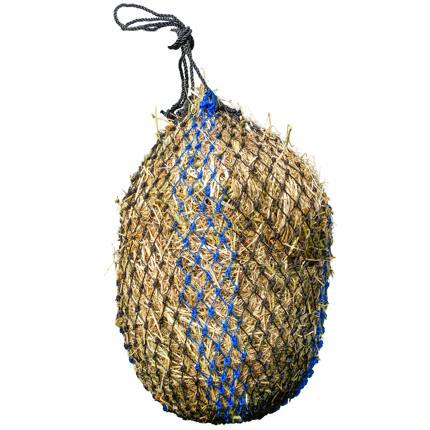 A large hay net made of durable nylon with small 4.5cm holes. Includes a large metal ring at the base for easily securing the hay net.