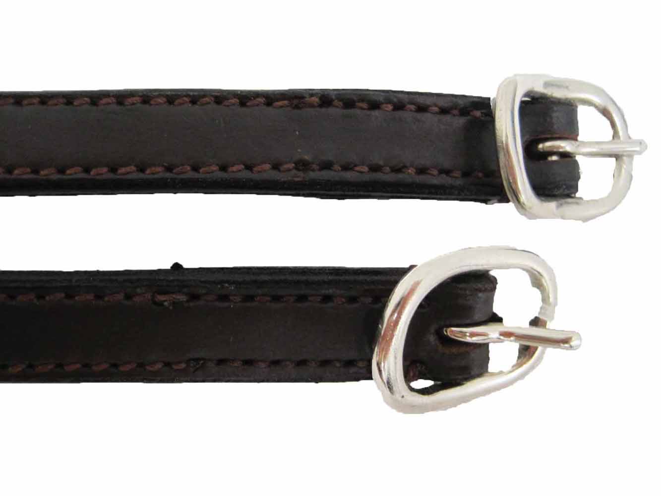 Stitched leather spur straps with smooth neat buckles. Available in Black or Brown.