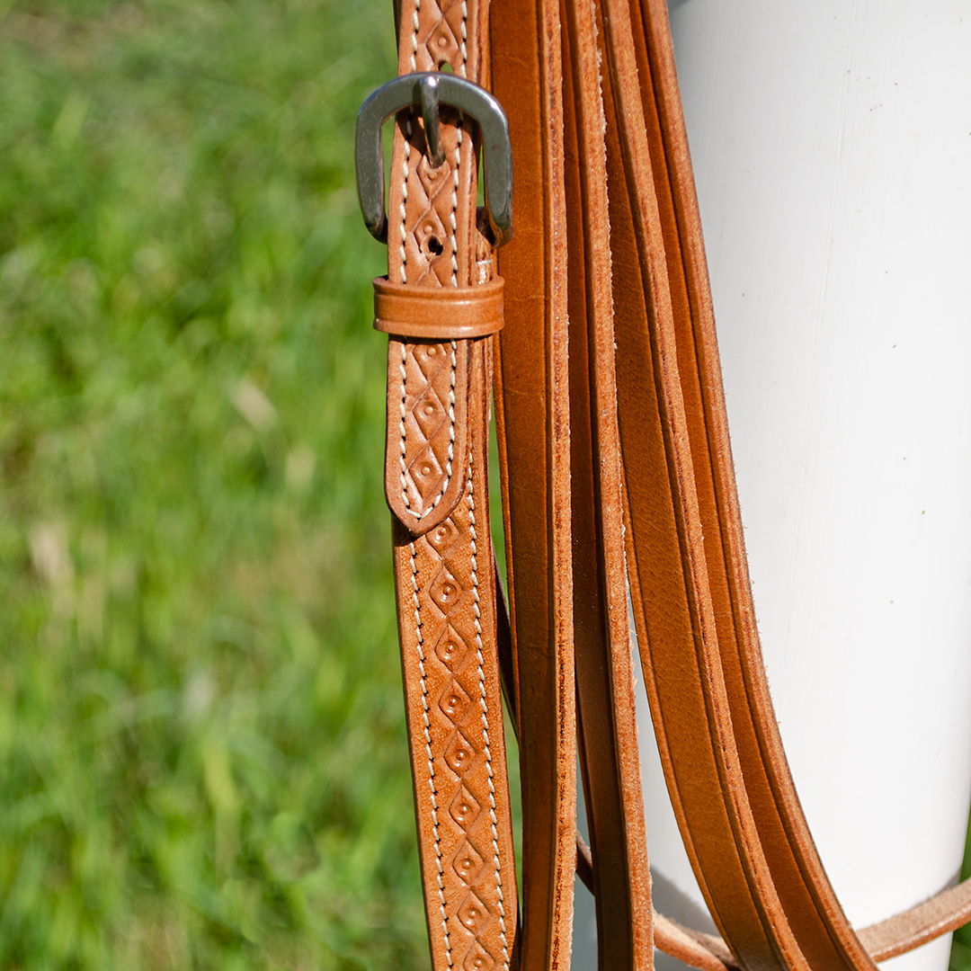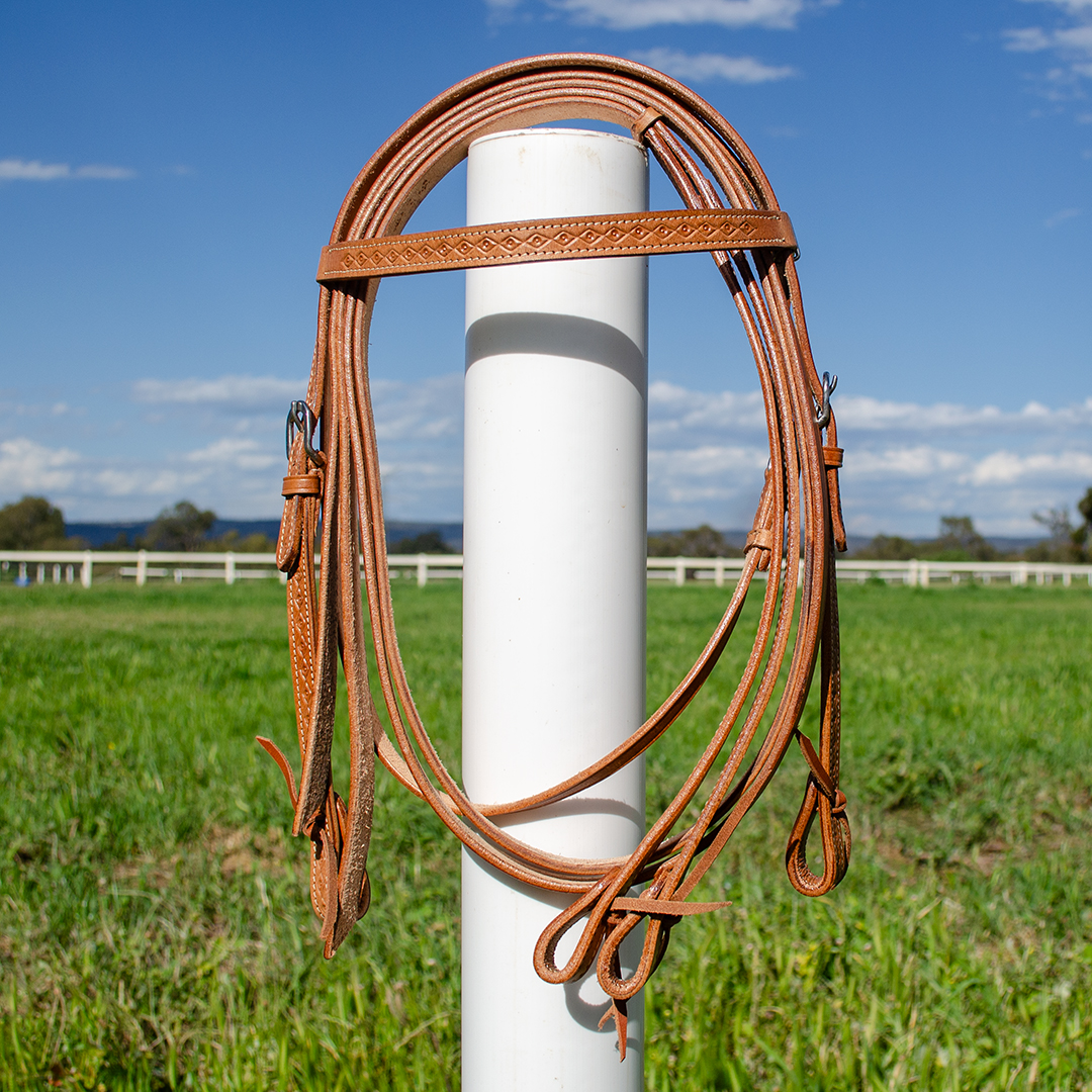 The Lazy River tooled western bridle is available in natural tank coloured leather with subtle but stylish tooled patterns. This bridle comes complete with reins and is available in cob & full sizes!